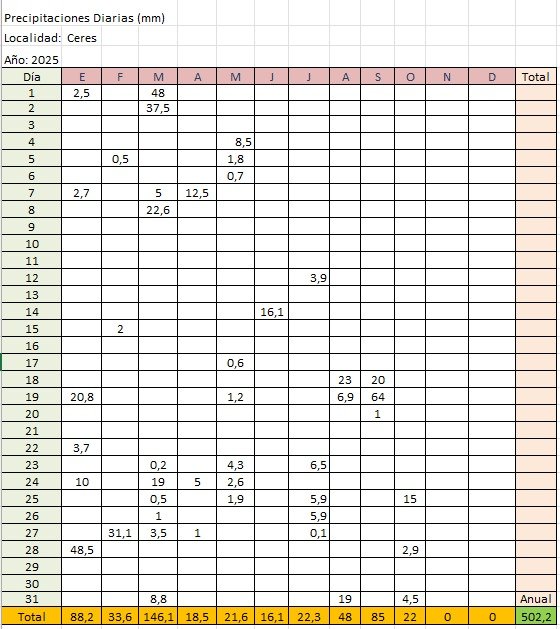 Ceresciudad.com accedió a un informe proporcionado por parte de la Estación Meteorologica Ceres, donde puede confirmarse la cantidad de milimetros caidos en este distrito mes a mes, y el acumulado total registrado en todo lo que va del año hasta el mes de octubre, salvando el dato de que aun restan 40 dias para cerrar este 2025 y que noviembre todavia no está registrado en la planilla oficial, y que dejó buenas lluvias.
