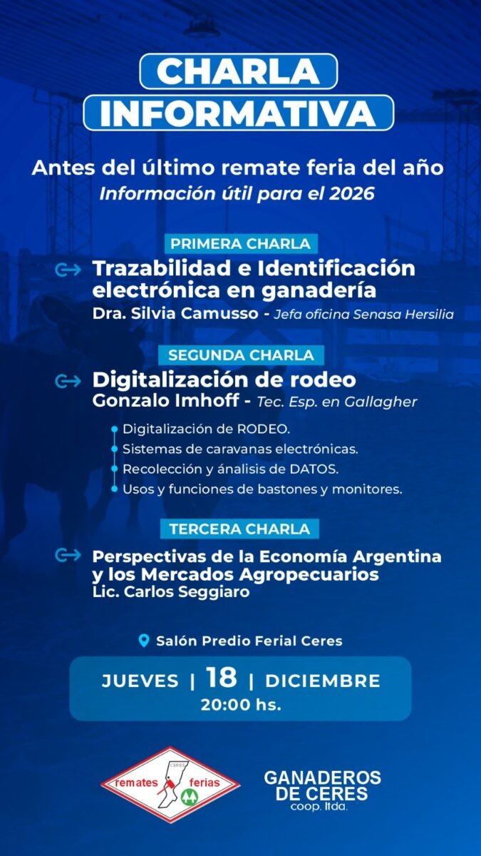 El dia jueves la firma ganadera llevará adelante tres importantes charlas referidas a la inminente digitalización de los rodeos, y de economia a venir, con un conocido de la firma como Carlos Seggiaro. «La entrada es libre y gratuita, y está enmarcada en el último remate anual de nuestra firma en Ceres».