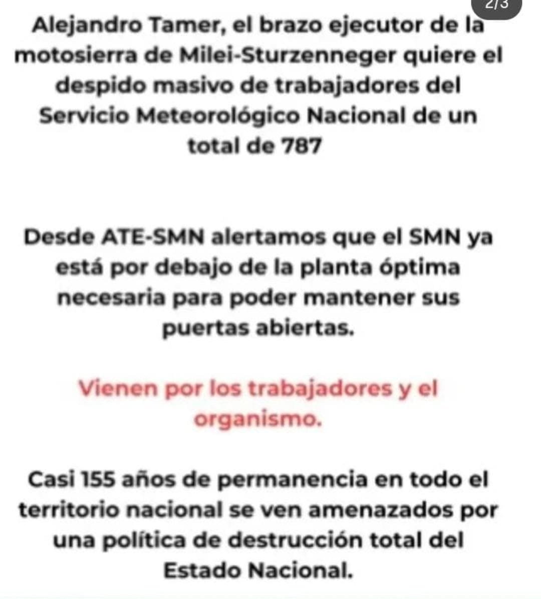 Los Trabajadores del Servicio Meteorológico Nacional (SMN) denunciaron que esta es una nueva avanzada del Gobierno nacional sobre el organismo científico–técnico y alertaron que el plan de “modernización del Estado” impulsado por la gestión de Javier Milei podría traducirse en un desguace del servicio y en despidos masivos.