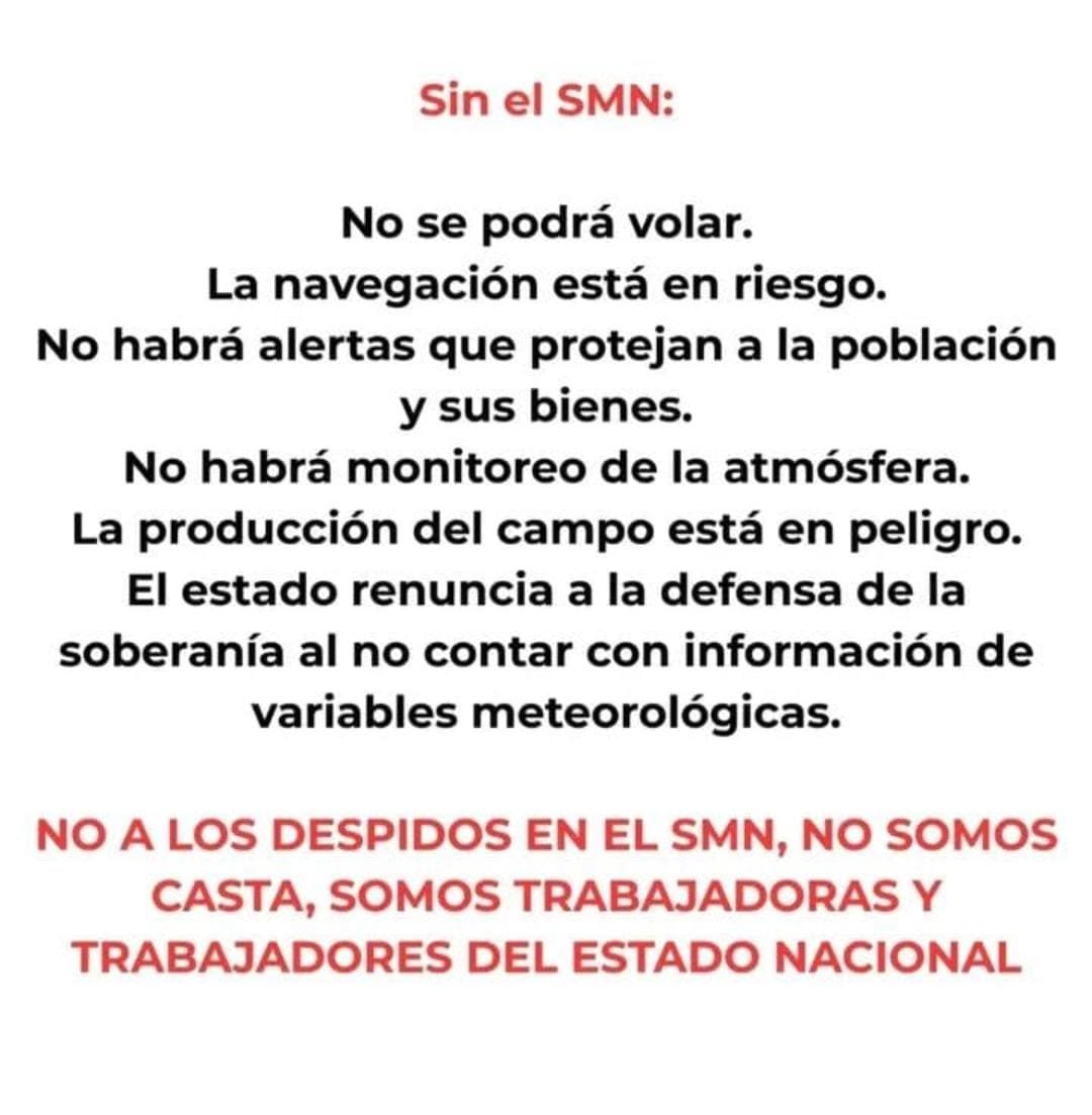 Los trabajadores del Servicio meteorologico Nacional atraviesan horas de enorme incertidumbre. El gobierno nacional quiere desguazar el SMN que lleva activo mas de 150 años, y lo explica con la sencilla razón de que «sobra gente, y hay que cuidar el supervait fiscal». Lamentable.
