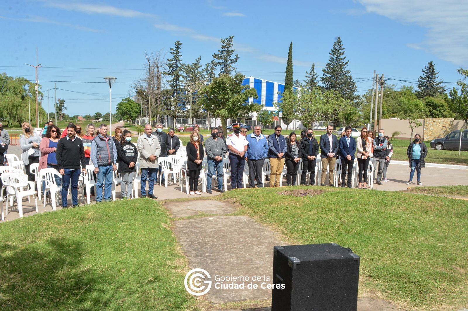 En el lugar estuvieron presentes banderas de ceremonia de los establecimientos educativos de los distintos niveles de la ciudad, autoridades políticas de distintas fuerzas de la ciudad, entre los que se destacaron Ignacio Lemos presidente del Concejo Municipal, el Concejal Camilo Busquets, los secretarios de hacienda Miguel Andrada, la secretaria de gobierno Regina Barrera, el coordinador de gabinete Guillermo Cravero, la Jueza de Faltas Jesica Beder, el secretario de obras y servicios públicos, y la secretaria de desarrollo humano Silvia Garcia, los responsables de la conducción de los partidos politicos locales como PJ y UCR; integrantes de las vecinales, e instituciones intermedias.